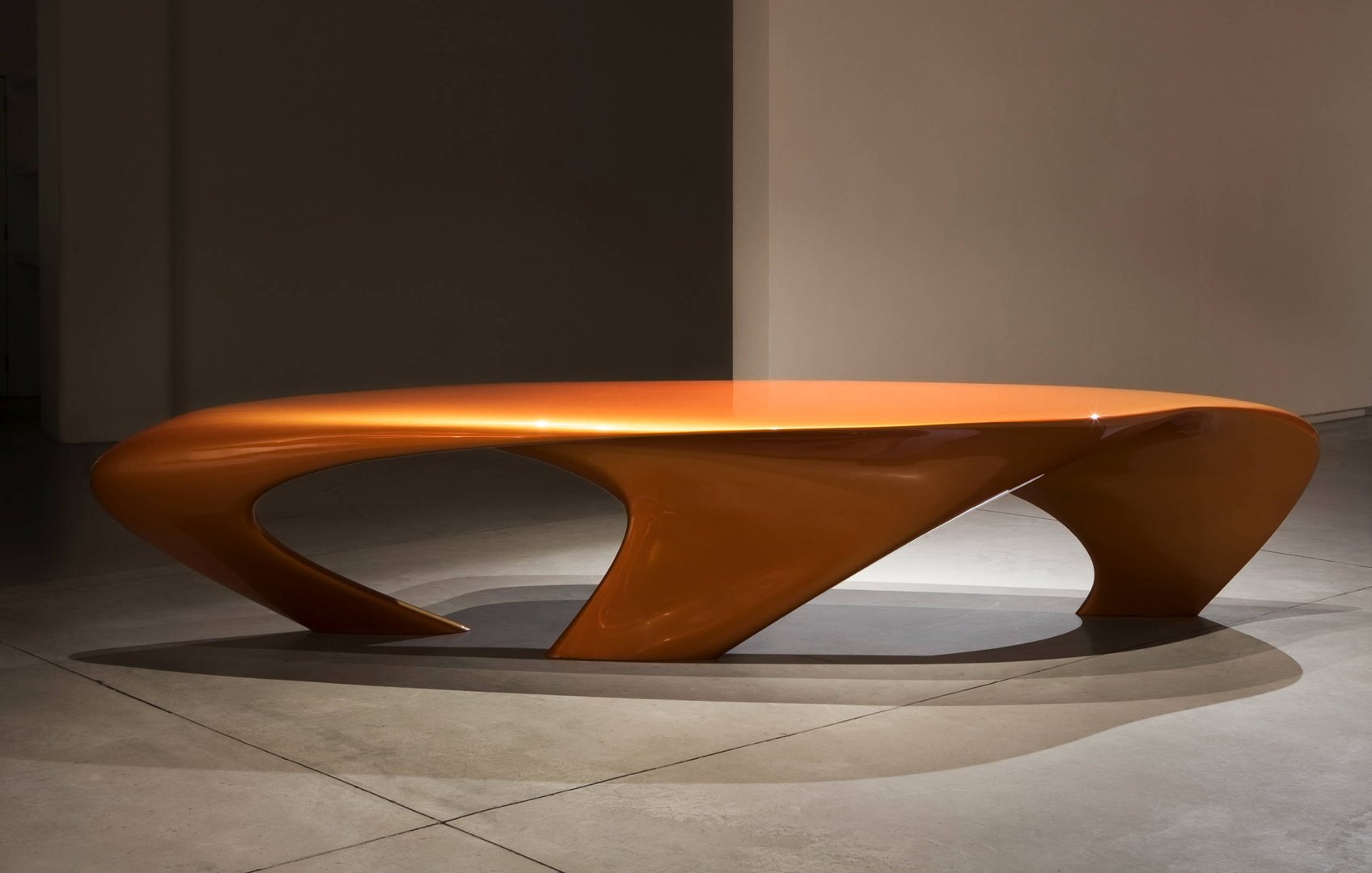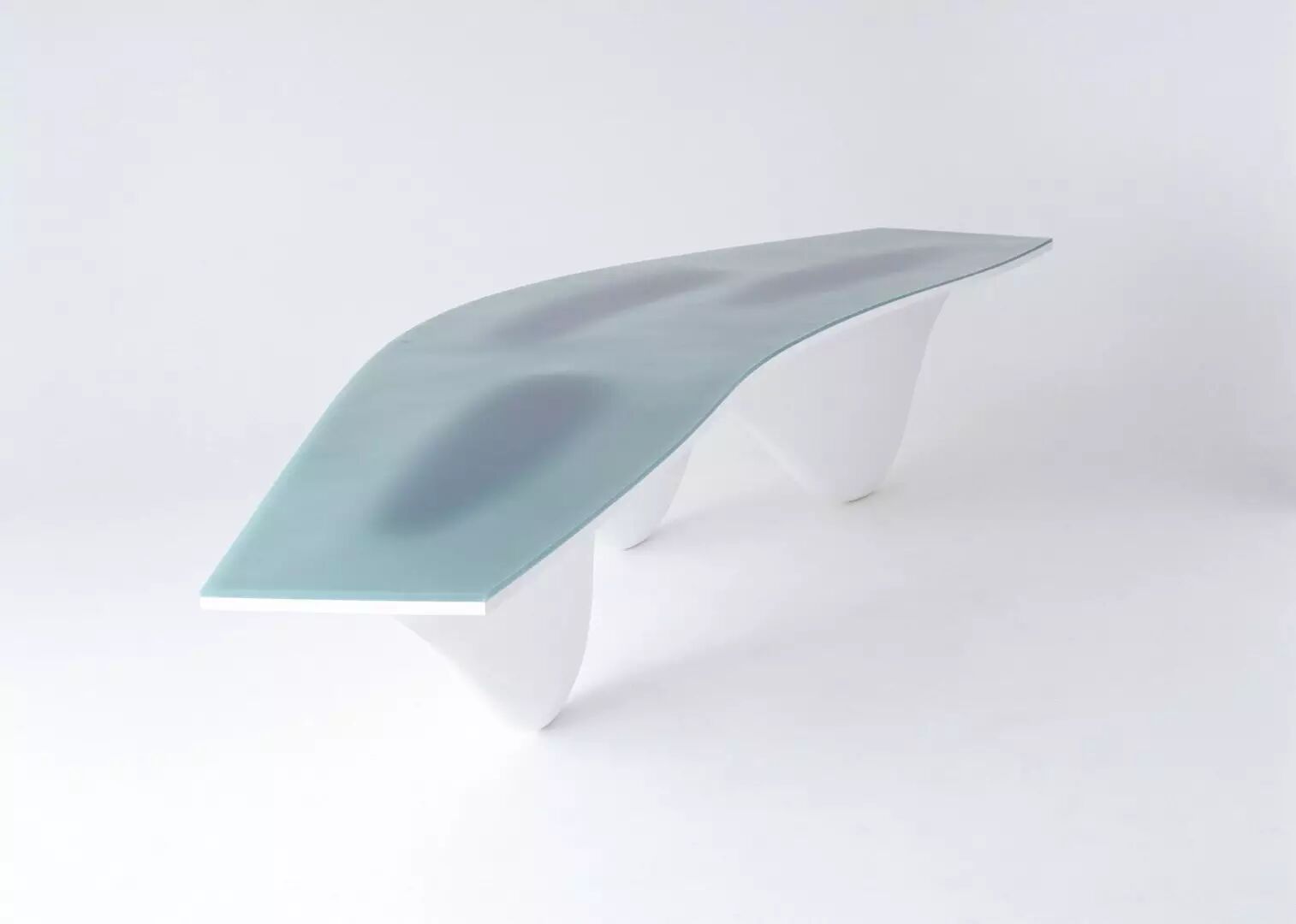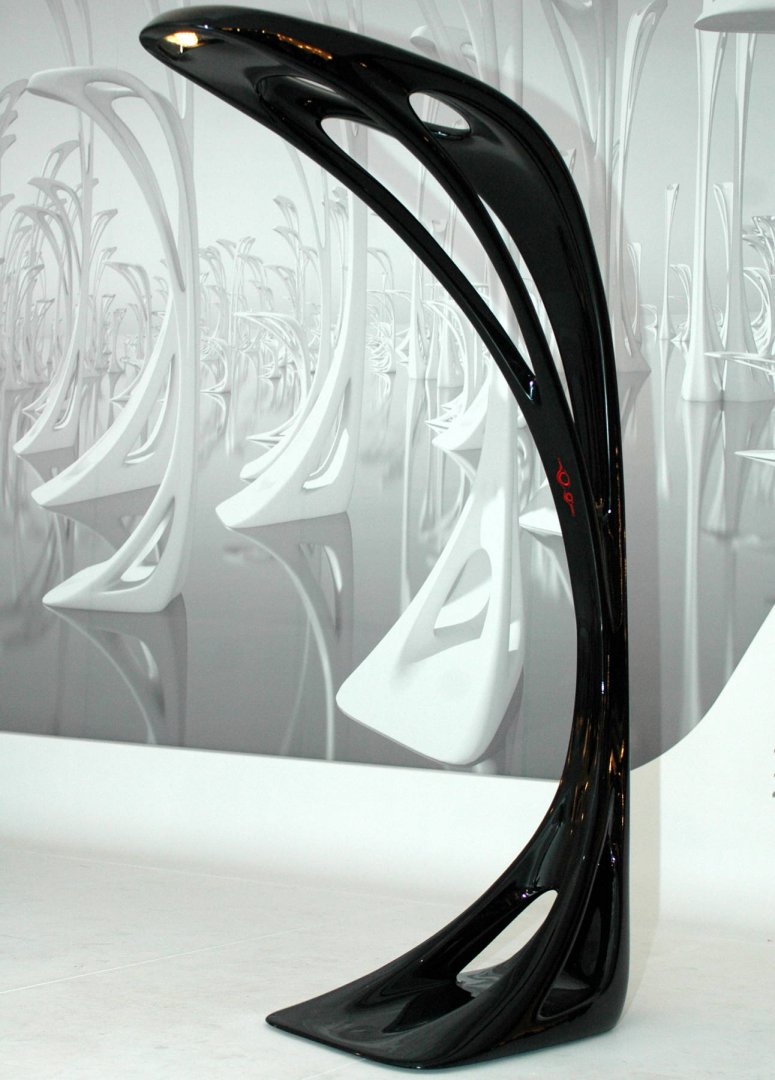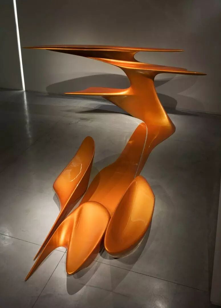 Aqua 椅子描述了运动过程中未知的力作用下,自然形成了极具动态感的桌子,桌面和桌腿一体化,无边无际,桌腿正上方的桌面更像三个深渊,离奇的视觉享受把人们带入一个自然的场景中。