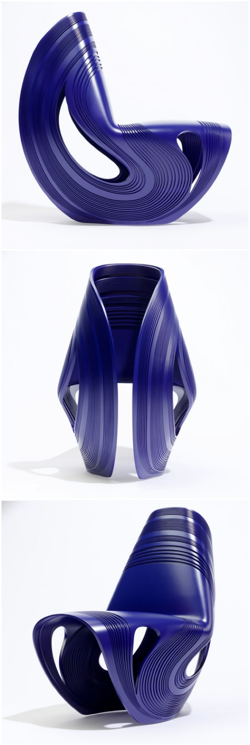 扎哈为意大利家具厂商 Sawaya & Moroni 设计了一款 KUKI 塑料椅,由一整块靛蓝色塑料圆盘折叠而成。圆盘朝两个方向折叠,两端在靠背后面几乎连在一起。