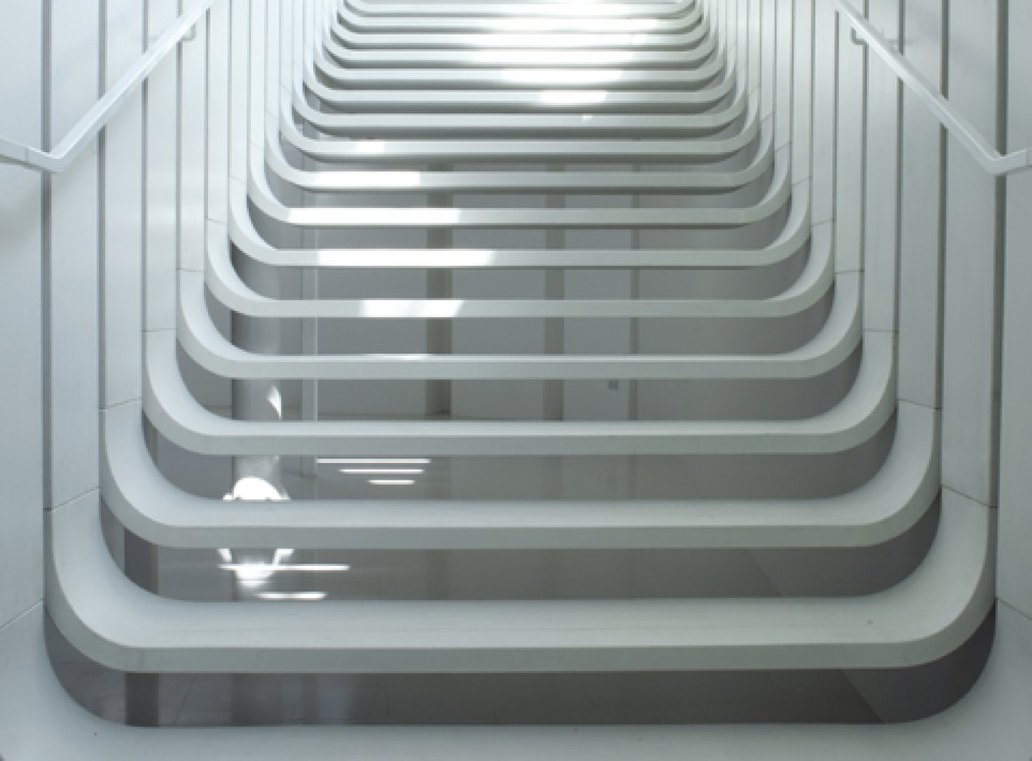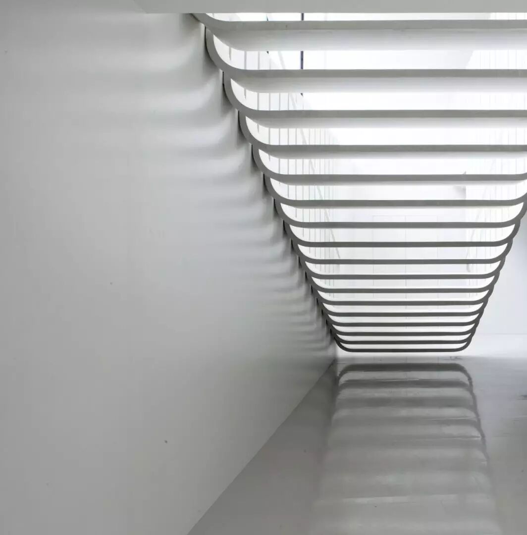 轻盈的漂浮楼梯使整个展览馆变得非常通透,每一个悬挂的台阶都以优雅的曲线围抱着中间,台阶之间的裂缝透出美丽的光,洁白的材质更增添了神圣感。