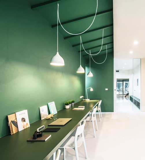 这个翻修项目大量使用了绿色,在60平方米的办公室,绿色和白色的天花板及墙,形成了一种色调反差。