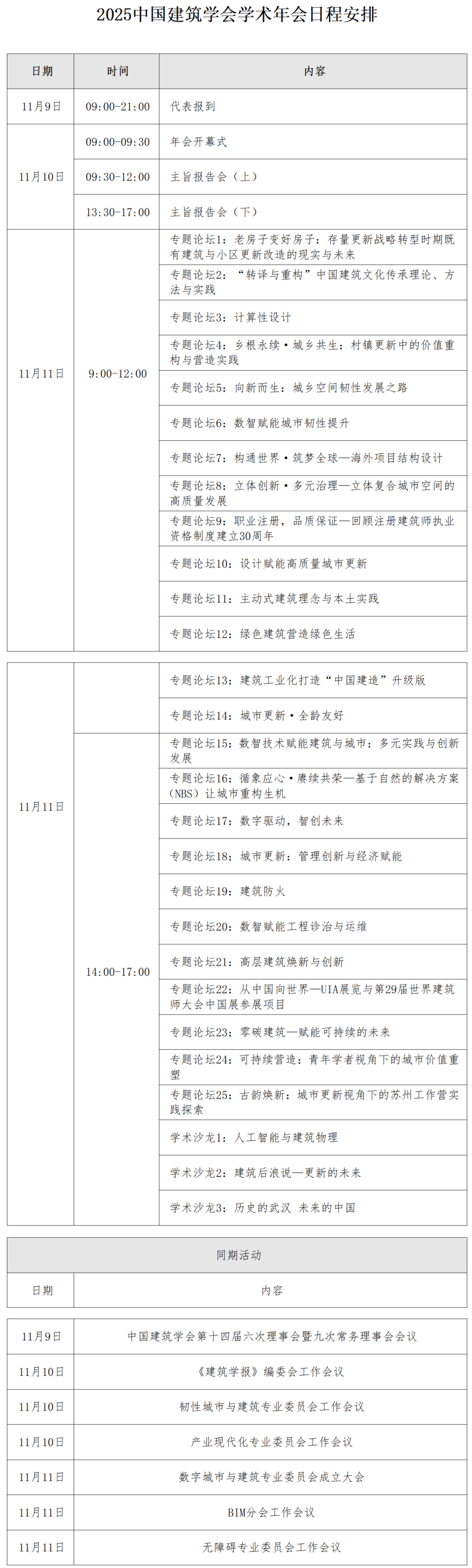 2025中国建筑学会学术年会定于2025年11月9-11日在武汉市召开。年会坚持以习近平新时代中国特色社会主义思想为指导,全面贯彻党的二十大和二十届二中、三中、四中全会精神,秉持创新、协调、绿色、开放、共享的发展理念,践行“适用、经济、绿色、美观”的建筑方针,突出学术引领与创新驱动。