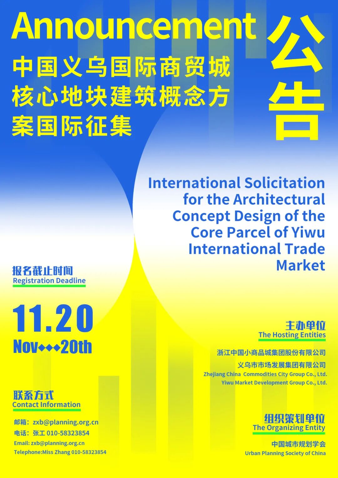Urban Planning Society of China (the organizing entity) has been commissioned jointly by Zhejiang China Commodities City Group Co., Ltd and Yiwu Market Development Group Co., Ltd. (the hosting entities) to launch this call for the International Solicitation for the Architectural Concept Design of the Core Parcel of Yiwu International Trade Market (hereinafter referred to as “the solicitation activity”). The relevant details are hereby announced as follows: